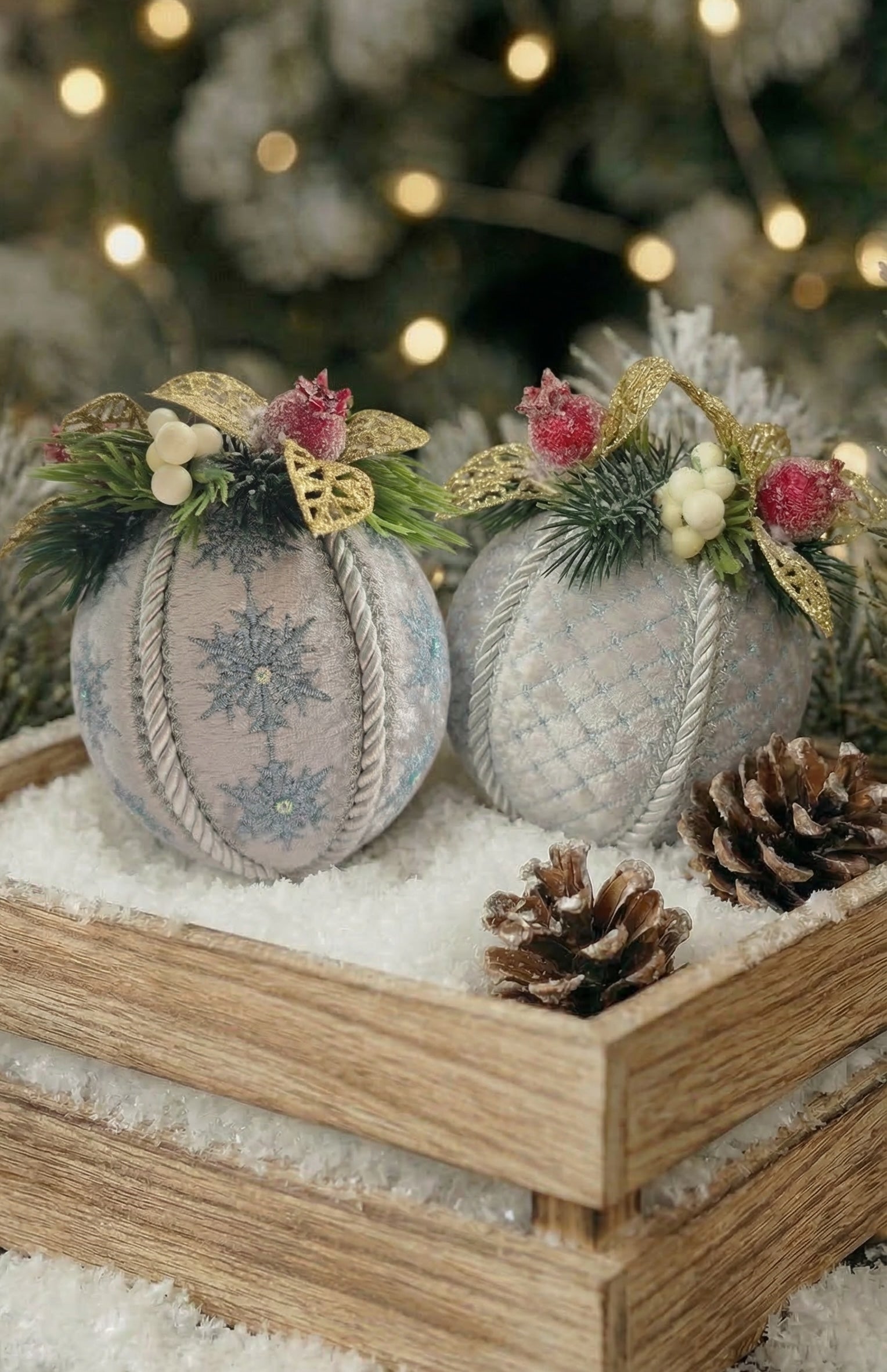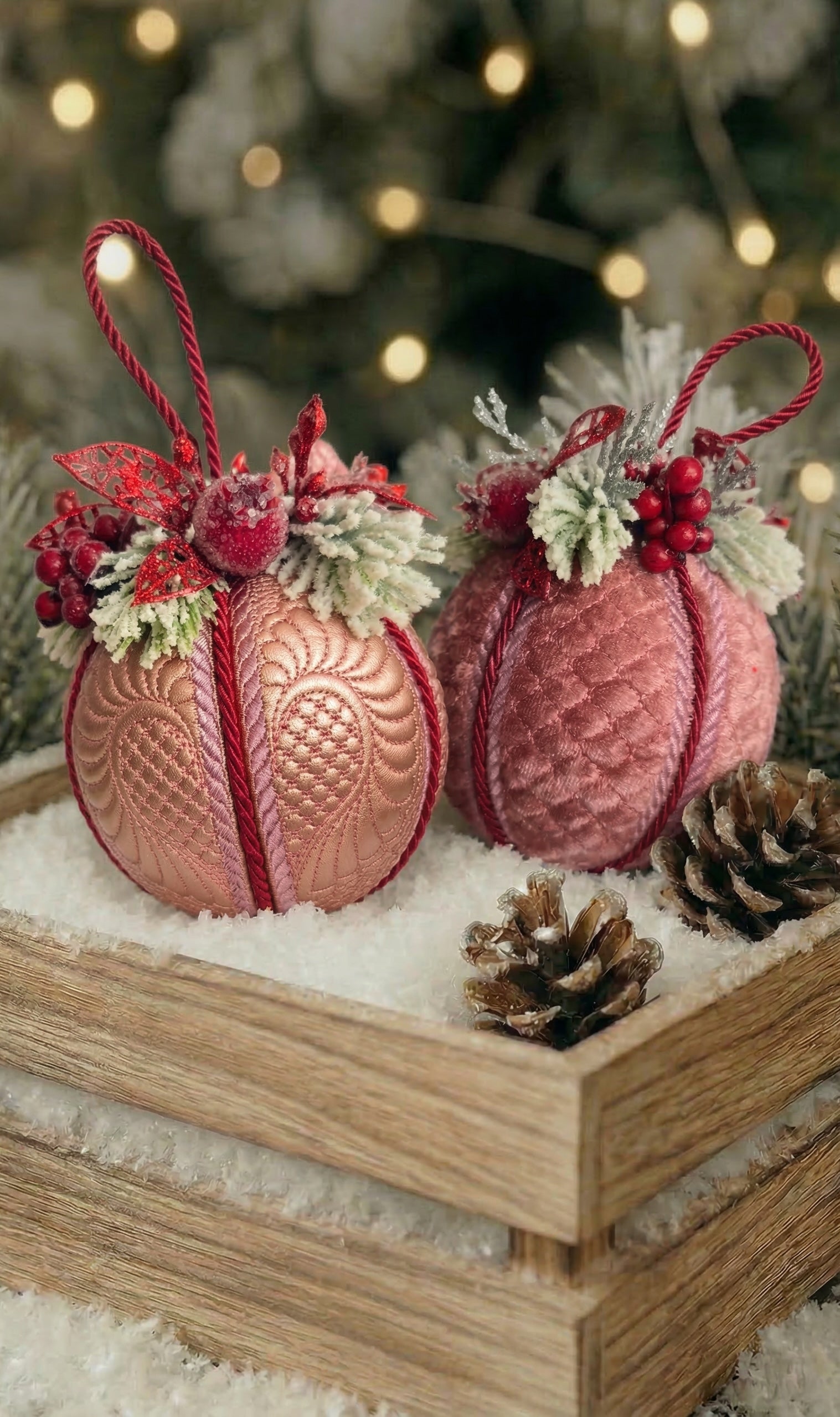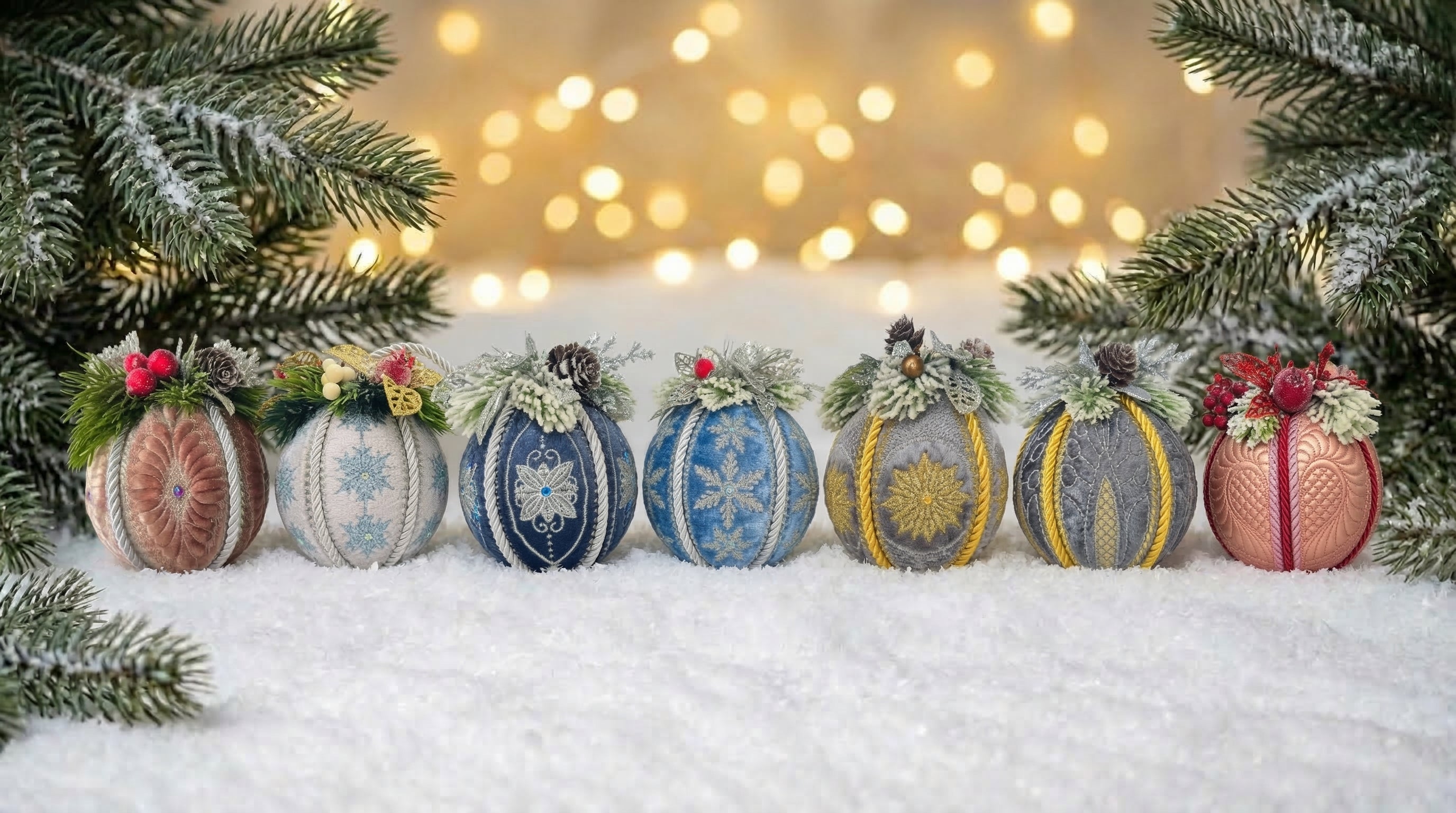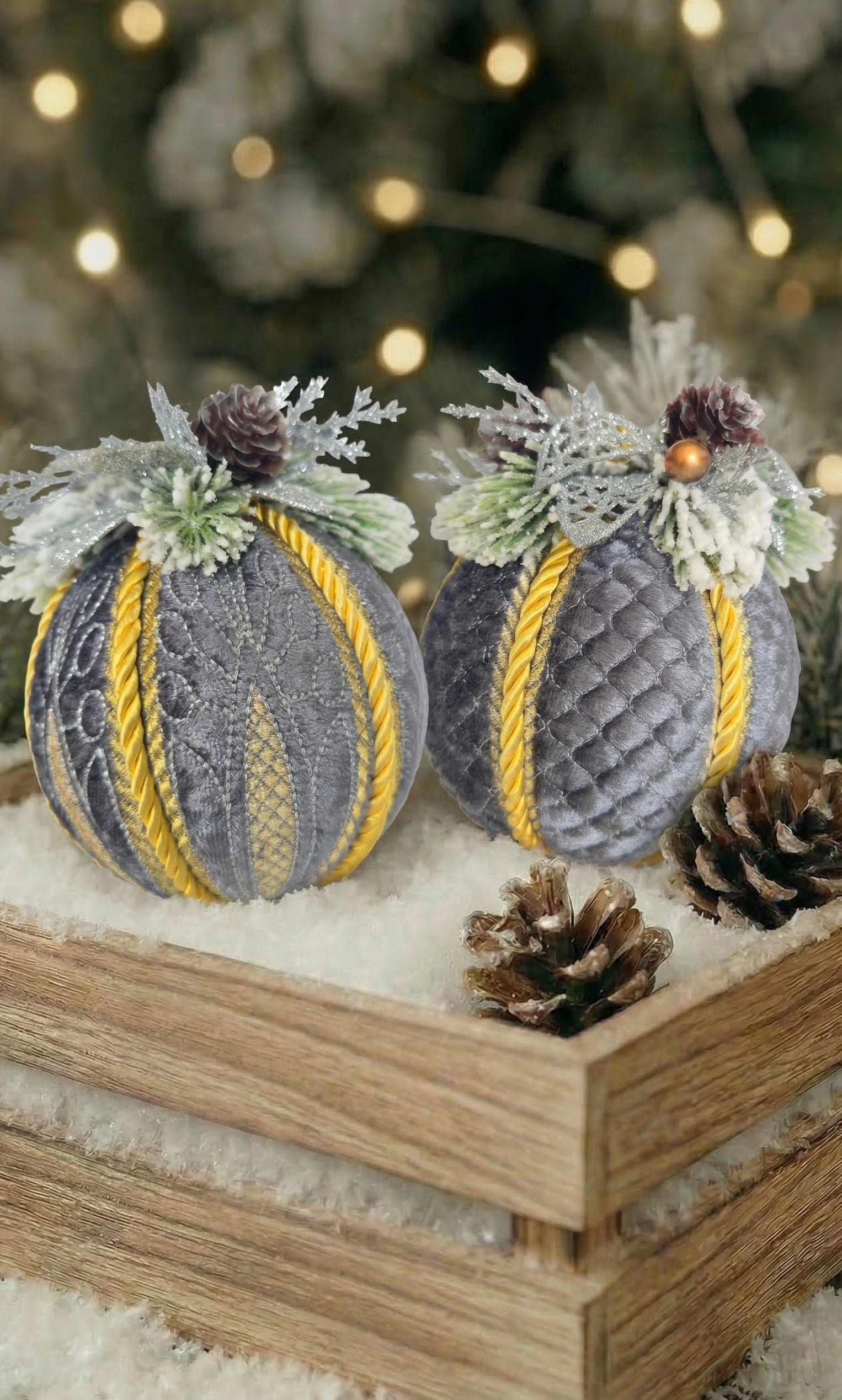 Alongside our DIY kits, we offer a collection of designer Christmas ornaments, carefully handcrafted with exceptional attention to detail. Each ornament measures 10 cm in diameter and is covered with embroidered fabric, giving it a refined and sophisticated appearance. ✨